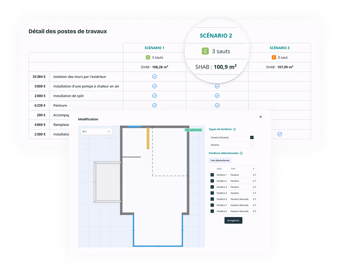 Nous mettons à disposition un moteur de calcul des aides qui permet de les visualiser durant la création des scénarios de travaux d'audit énergétique